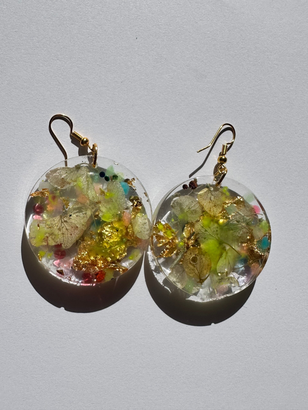Estos pendientes únicos están elaborados a mano con resina transparente de alta calidad, encapsulando delicadas hojas naturales, pétalos de colores y fragmentos de pan de oro que les otorgan un brillo elegante y sofisticado. Su forma redonda y ligera los hace cómodos de llevar, mientras que los tonos verdes, rosados, azules y dorados reflejan la belleza de la naturaleza en una pieza moderna y artística.