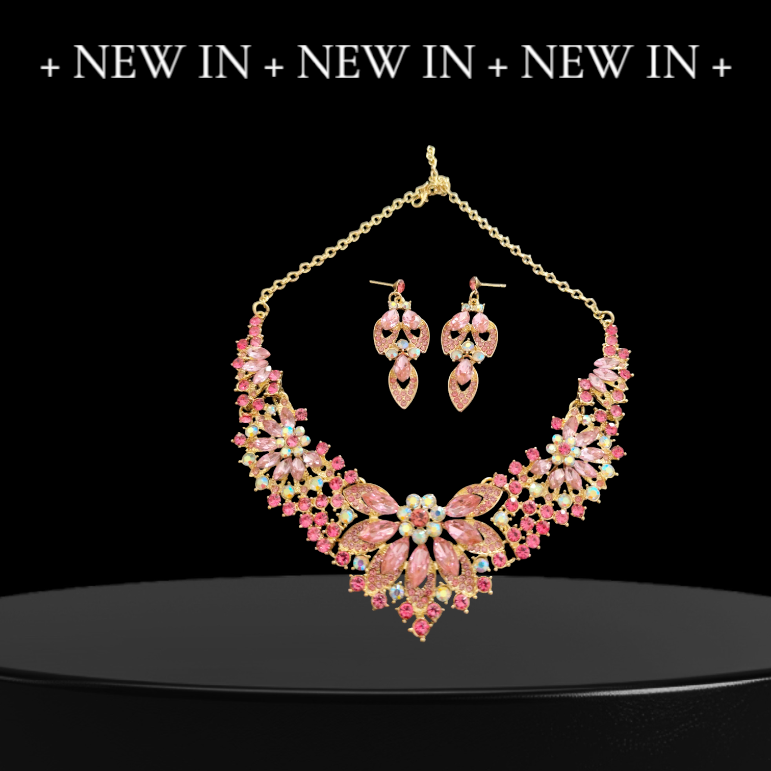 Este conjunto de collar y pendientes destaca por la exquisita selección de piedras claras, matizadas con sutiles destellos azulados que capturan la luz con un brillo singular. Cada pieza ha sido cuidadosamente elaborada para lograr un equilibrio perfecto entre sofisticación y modernidad, convirtiéndose en una joya de distinción que realza cualquier ocasión con un aura de lujo discreto.