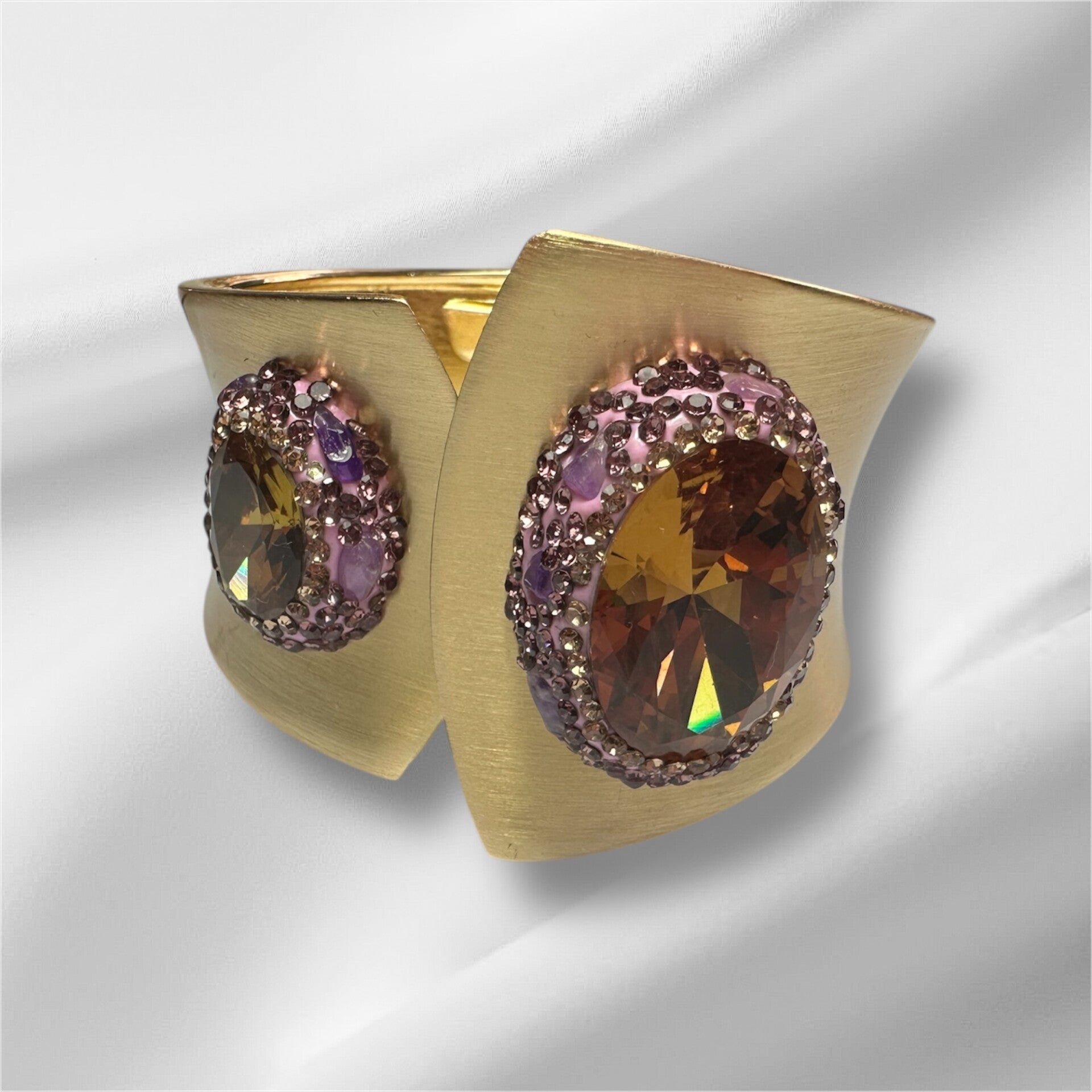 Pulsera elaborada en aleación de cobre bañada en oro, con un diseño elegante y duradero. Incorpora piedras naturales, cristales checos y elementos fotocromáticos que cambian de tono según la luz, creando un brillo único en cada momento.